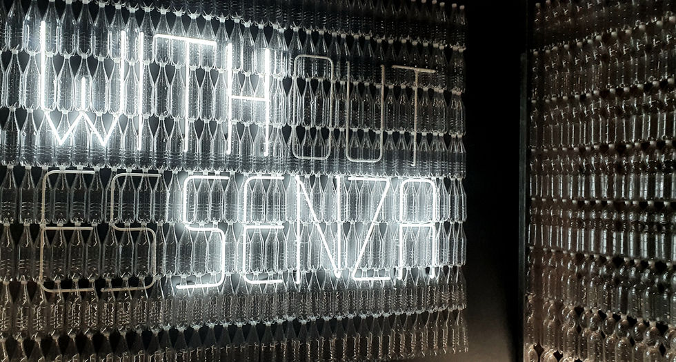 Il visitatore scosta la tenda di bottiglie e, varcando la soglia entra in un limbo e comincia la sua metamorfosi. Gli opposti WITH - SENZA rimbalzano nella mente, suscitano confusione e provocano auto/ispezione, come singolo individuo e come parte di una società in evoluzione, in cambiamento, in trasformazione.